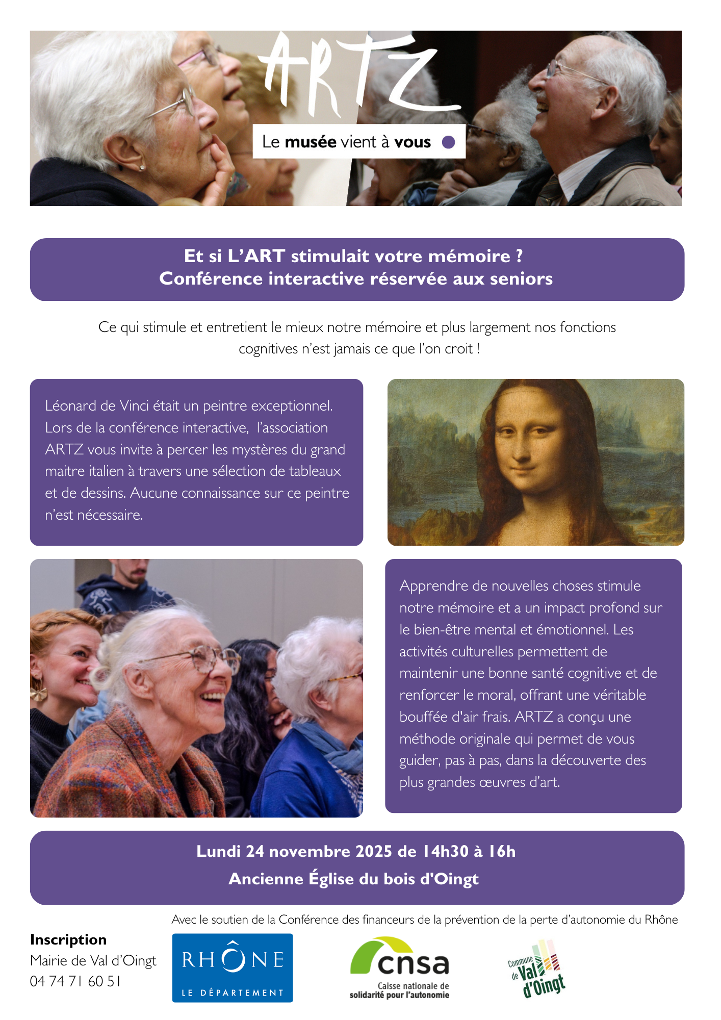 Un nouvel atelier/conférence pour les seniors aura lieu le lundi 24 novembre à 14h30 à l'ancienne église du Bois d'Oingt. On vous attend nombreux, c'est intéressant et gratuit. Le thème du jour : Léornardo da Vinci !